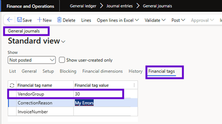Entering the values of Financial Tags on Journals and Lines transactions