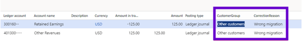In the posting lines, these values will be the default values for transactions, but you can change them if you want. In this case, I use a value in the journal header and change that value on one line of the journal: