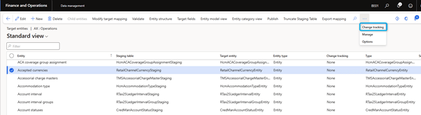 - On the Target Entities page, select the entity in the grid and then, in the Actions pane, on the Change Tracking tab, select Disable Change Tracking.