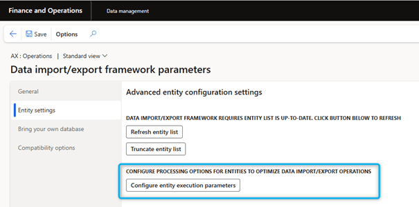 - On the Data Import/Export Framework Settings page, in the Entity Settings tab, select Configure Entity Executions Parameters.