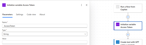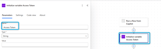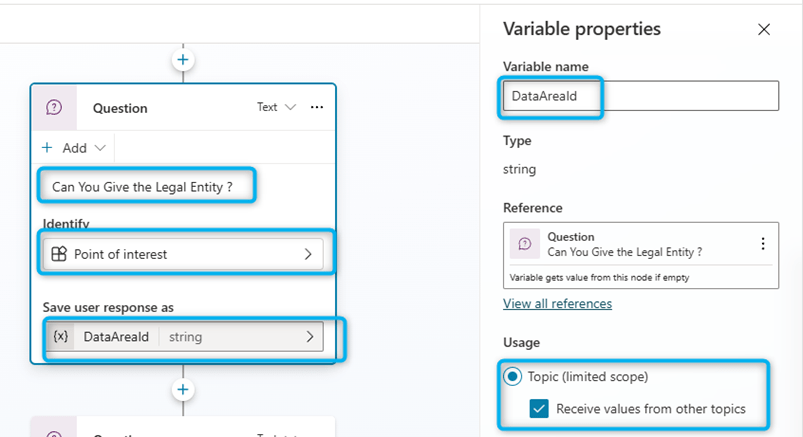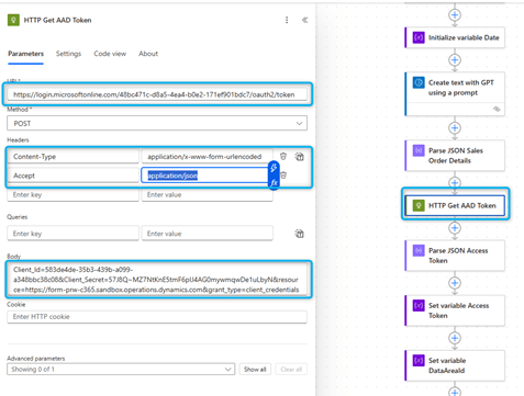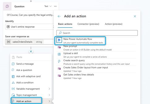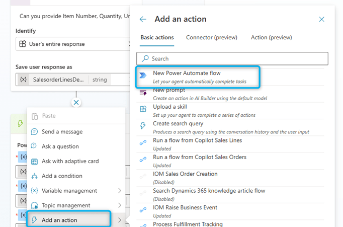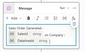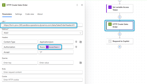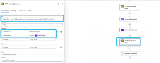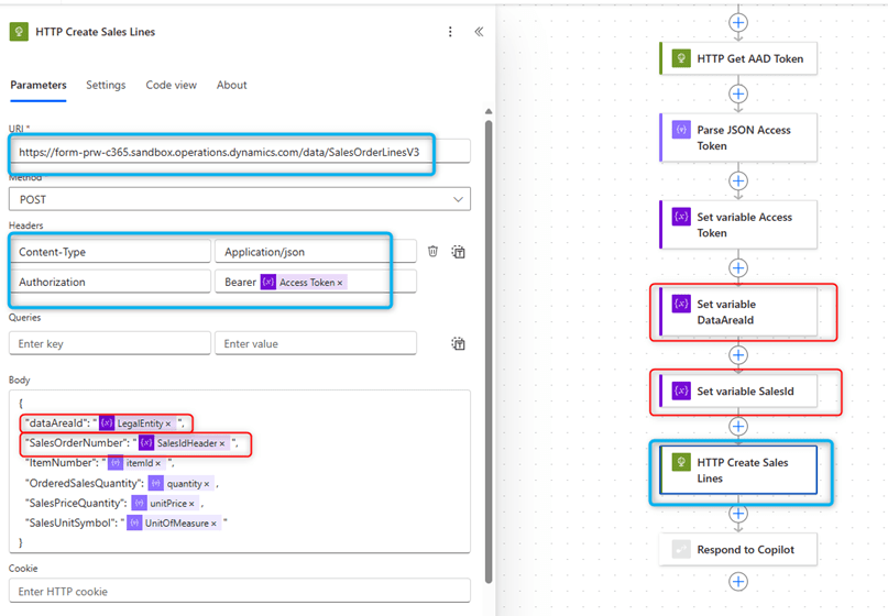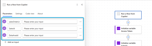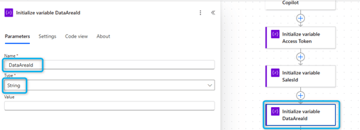 I have created two variables SalesId and DataAreaid to store parameters coming from Copilot studio.