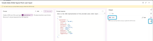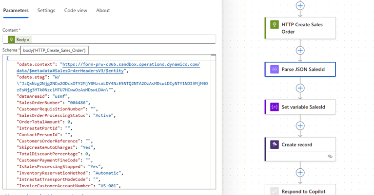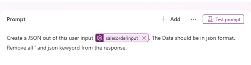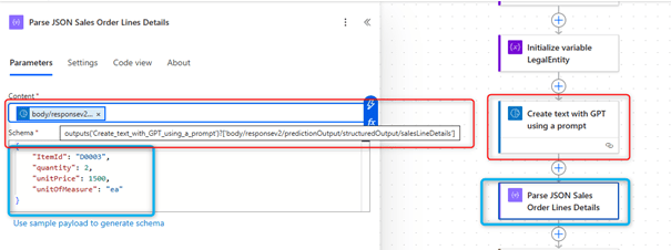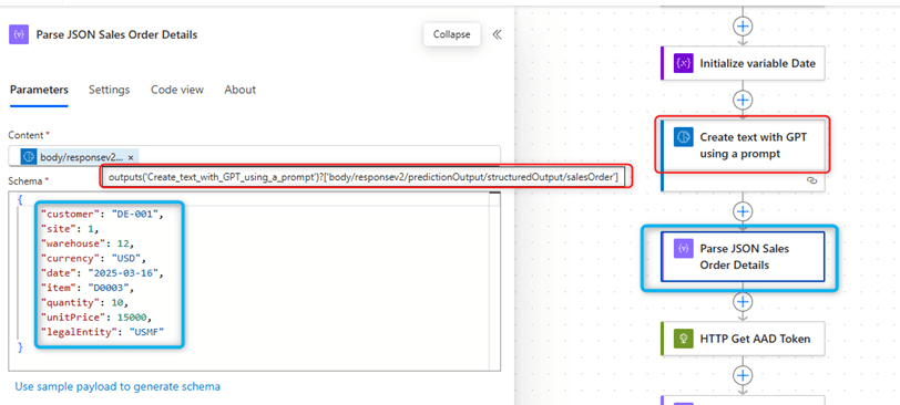 The JSON schema that we use is the one defined during the prompt: this will essentially help us get all the values of the variables for Customer account number, Item Id, Qty, sales price, etc. With these variables we will create the sales order, in the subsequent steps.