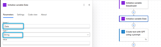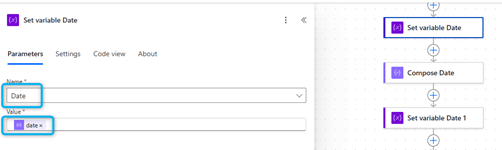As my date is in format dd-mm-yyyy and in the different data entities for header and lines the dates are yyy-mm-dd, I correctly format the date. First, I create a variable Date: