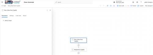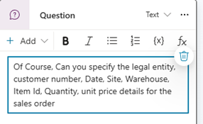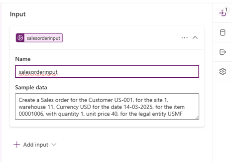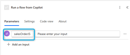 The first thing to do is to create an input that we be used to store the phrase enter in the copilot question (store in copilot studio in the variable: salesOrderDetails’).