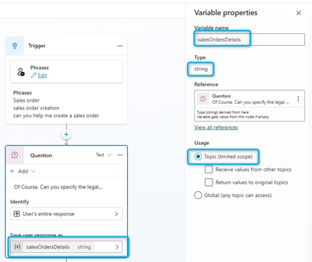 This variable SalesId will be the response of the flow and show to the user in Copilot, same thing for the legal entity. We initialize a variable: