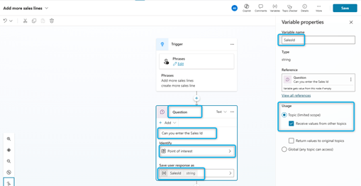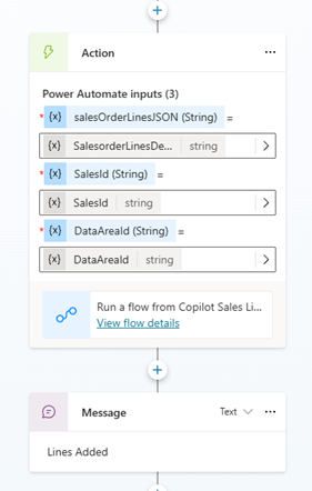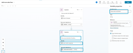 The New Topic is ‘Add more sales lines’, and I am passing my newly created SalesId, Legal Entity and SalesOrderDetails variables to this topic.