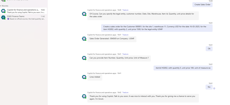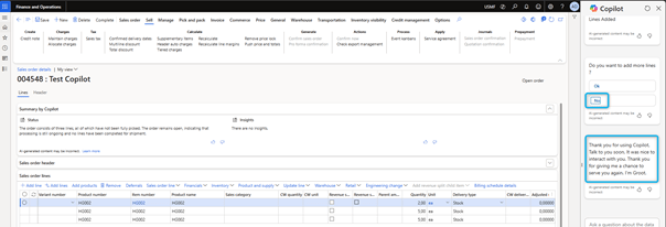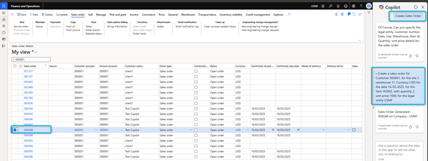 So, let us start to create a Sales order in D365 Finance with Copilot with the next sentences:
