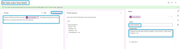 This would translate the values of Customer code, site, warehouse, item Id, quantity, etc. as a JSON. Click on test prompt, it will show you like this:
