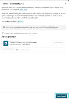We saw that we could create orders in D365 Finance with Copilot, but it is possible to do the same directly in Teams. For this on the agent go to Channel and click on Teams + Microsoft 365: