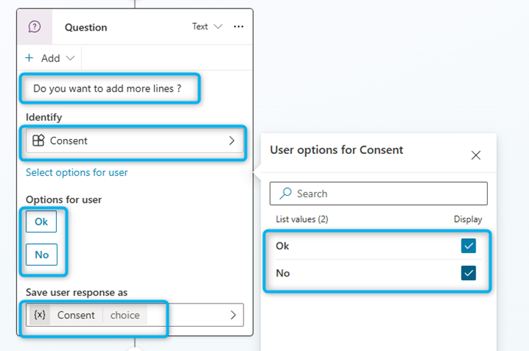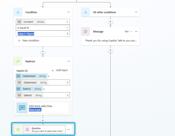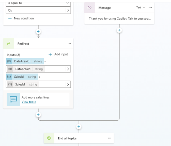 If the User chooses OK, it will create transfer the call to another Topic: Add more Sales lines.
