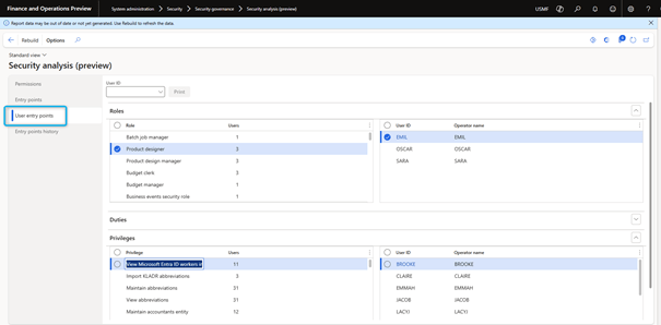 - User entry points: get a complete security profile of a selected user. This profile shows which roles are assigned to the user, what duties and privileges are assigned to the roles, and which entry points are accessible to the user. Users can view other company users who have a similar level of access.