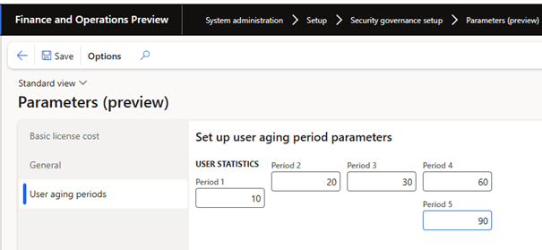 2. In the User aging periods tab, configure all five-day ranges as required.