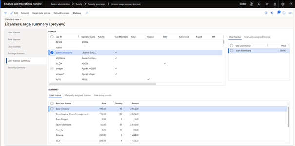 - Recalculate prices – Recalculate the prices of licenses used for users, roles, duties, and privileges.