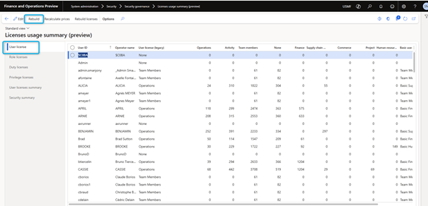 - Rebuild licenses – Rebuild the licenses used for users, roles, duties, and privileges. All users who have a small number of entry points at the operational license level may see their access redesigned and be moved to the activity or team member level.