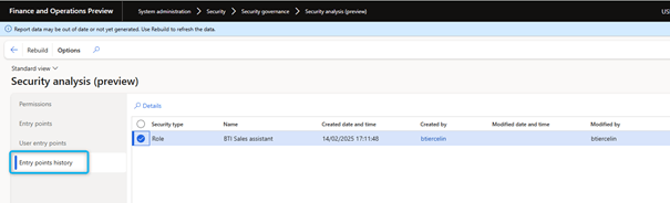 - Entry point history: get a complete history of changes to the security configuration. Various data points such as Creation date and time and Creation by are captured for roles, duties, and privileges. Users can also view the XML file and differences from the previous version of the same object.