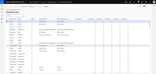 The User activity aging report tracks information related to connection to D365 finance. Therefore, it allows administrators to effectively monitor user activity. Some of the most common monitoring ranges are 10, 30, 60, 90 and 120 days. Daily ranges are configurable and can be customized to meet the needs of the organization. The data in this report is used to optimize license costs.