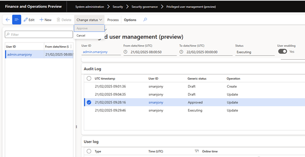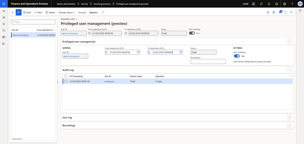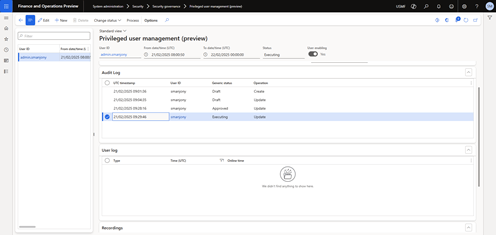 The User Log captures all sessions when one of the selected user accounts logs on D365 Finance during the privileged user session. This log tracks the user’s activities and time spent on each session.