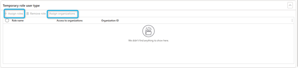For a new temporary role session, select Assign roles to assign the temporary roles to the selected user account. You can also select Assign organizations to assign temporary roles to the selected organization only, not all organizations.