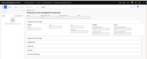 The User Log captures all sessions when one of the selected user accounts connects to the D365 Finance during the active temporary role session. This log allows you to track user activities and time spent on each session. It also captures the end date of the current session.