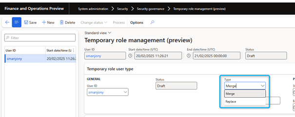 - Merge: add temporary roles to existing user account roles. After the session of the temporary roles ends, users retain their original roles and added temporary roles are revoked.