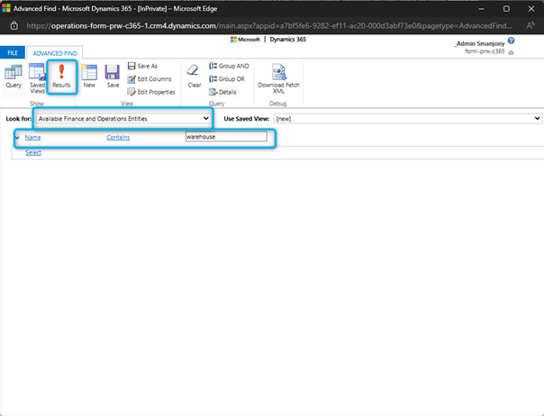 - In the Find drop-down list, select Available Finance and Operations Entities, apply additional filters, if necessary, then click on Results.