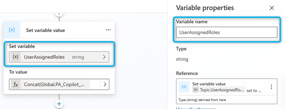 So we declare a variable called “UserAssignedRoles” and its code is as follows. Then, I get the rights/roles of the connected user as a table variable by calling: Global.PA_Copilot_ServerForm_UserContext.securityRoles