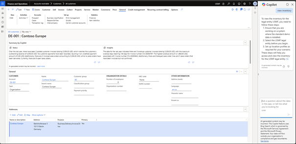 - The Copilot sidebar: a bot chat to help users use D365 Finance to consider when using it.