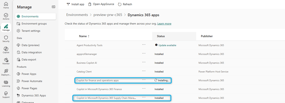 These two applications must be installed in Dataverse for your selected finance and operations environment: