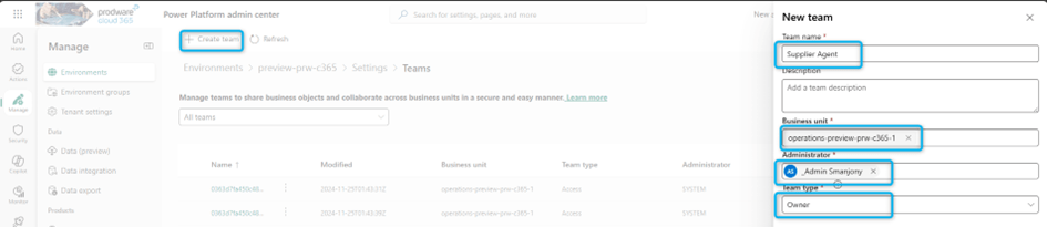 - In the New team dialog, specify a name, business unit, and administrator as required. Set the Team type field to Owner.
