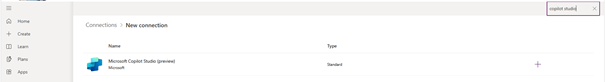 - Find the connection with a Name of Microsoft Copilot Studio (preview). Select Create for that row and follow the instructions on your screen. Sign in as the intended agent identity when prompted.