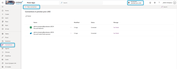- Create a Copilot Studio Preview connection with the same identity.