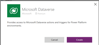 - Use the Search field at the right side of the page to find the connection with a Name of Microsoft Dataverse (if you see two, use the one with the green icon). Select Create for that row and follow the instructions on your screen. Sign in with the intended agent identity user when prompted.