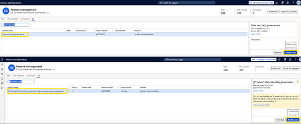 Before accessing the user security governance workspace, you must activate it in feature management: