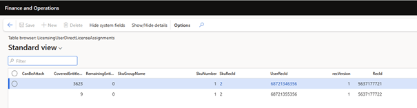 The data of the first grid comes from the view LicensingUserDirectLicenseAssignments . Let’s open it and look at it using the table browser. It contains the same information as those displayed on the screen: values like UserRecId and SkuRecId . These values indicate the user and the license type