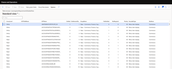 Let’s now move on to the main view where license requirements are displayed: LicensingUserRequirementsDetailedView. This table may contain many records, as it is duplicated by license type and can include thousands of rows, all generated based on the roles assigned to the user.