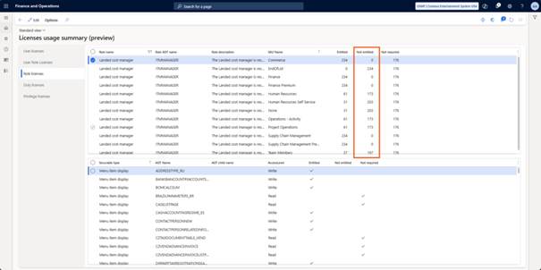 - Role licenses: Allows for role-based analysis. Displays the SKU licenses correspond to a role, as well as its duties, privileges and AOT components.