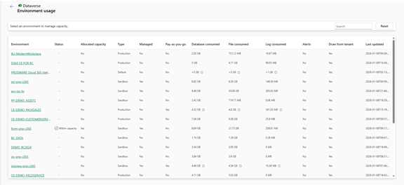 A very useful addition is the per-environment usage breakdown. At the bottom of the preview page, administrators can now view capacity consumption for each D365 Finance & SCM environment through dedicated tabs.