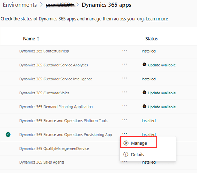 - On Dynamics 365 Finance and Operations Provisioning App, click … > Manage.