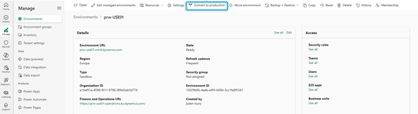 It is also possible to convert a Sandbox environment into Production directly in PPAC