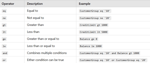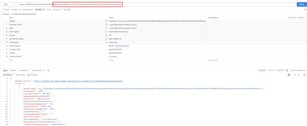 - CustomerAccount eq ‘ DE-001’: Retrieves only the records where Customer Id is equal to DE-001.