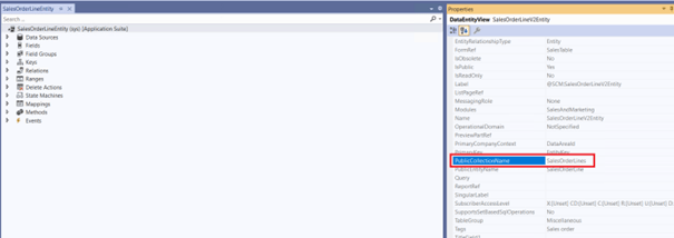 “SalesOrderLines” is the public collection name of the entity. You can find the public collection name by opening the entity in Visual Studio, as shown in the figure below.