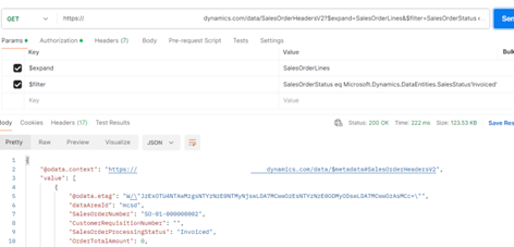 https://<D365 URL>//data/SalesOrderHeadersV2?$expand=SalesOrderLines&$filter=SalesOrderStatus eq Microsoft.Dynamics.DataEntities.SalesStatus’Invoiced’