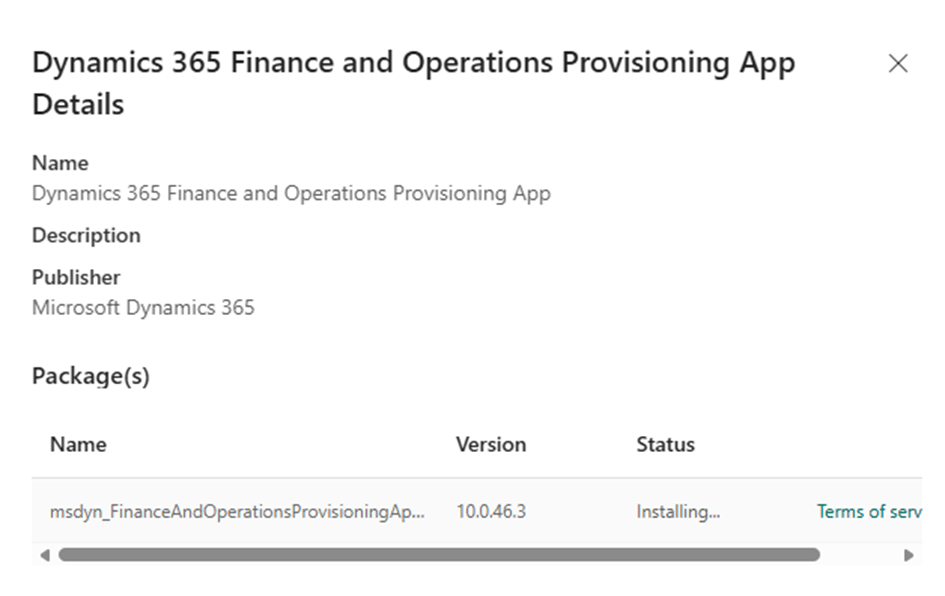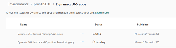 - Back on the Dynamics 365 Apps screen, Dynamics 365 Finance and Operations Provisioning App will show the status “Installing”.