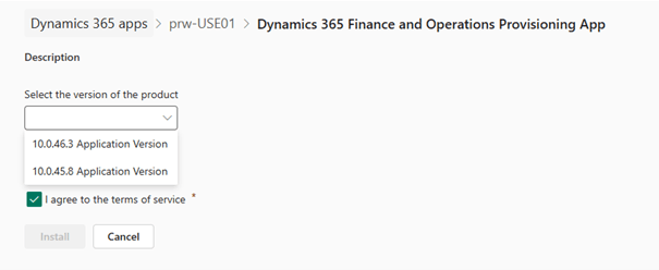 - Click the dropdown under “Select the version of the product” to view the available Finance and Operations versions. If the updated environment is configured for the preview version, the preview build will also appear as an option (not the case here).