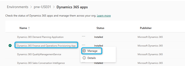 - In the list of Dynamics 365 applications, find the app named Dynamics 365 Finance and Operations Provisioning App. Click the three‑dot menu, then select Manage.