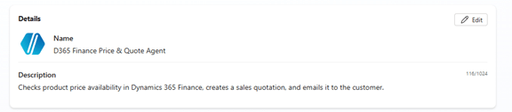 The agent helps users check product price availability in Dynamics 365 Finance, generate a sales quotation, and send it to the customer via email.