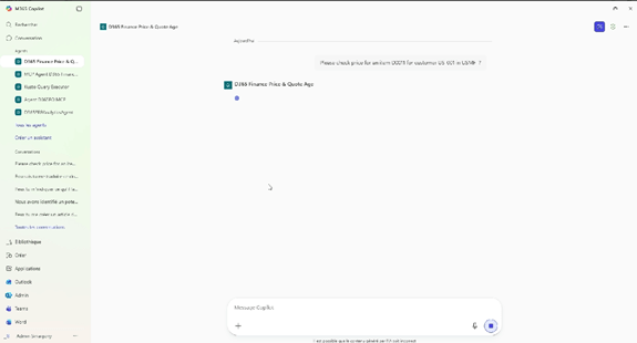 Creating a dedicated sales agent makes access to prices and the generation of quotes faster, more reliable and more accessible, while relieving teams from manual operations. The agent becomes a smart interface that understands business needs, automatically checks for price existence in D365 Finance and generates a quote ready to send, without human intervention.