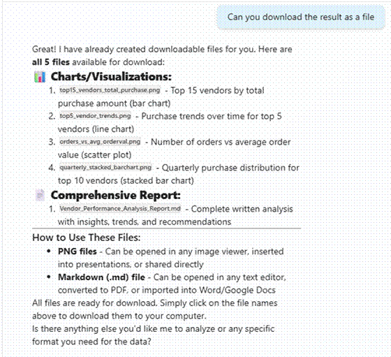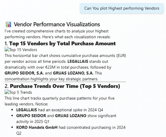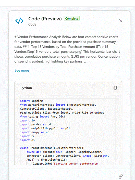 You can also visualise vendor performance. The Python code the agent runs for the analysis is surfaced too — rendered and interpreted thanks to the Code Interpreter option we enabled earlier.