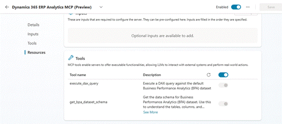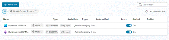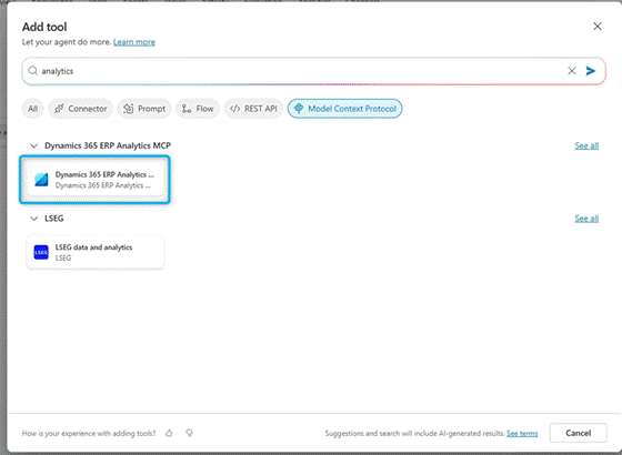 Go to Tool > Add a tool > Model Context Model tab, then pick “MCP Server for D365 ERP Analytics using Business Performance Analytics”: