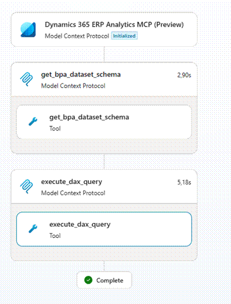 Give it a spin. The agent first calls the tool to fetch the BPA dataset schema, then runs the DAX query: